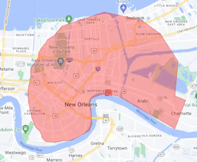 - DoorDash has given us a 5 mile delivery radius from our store but it does not include the Westbank (not our choice, sorry…). Plug in your address on our online ordering portal (click here) to confirm you are in the range. It includes the Marigny, Bywater, French Quarter, Upper & Lower 9, Arabi, some of Chalmette, Treme, 7th Ward, Gentilly, Midcity, a slice of NO East, CBD, Garden District, LGD, Irish Channel and a bunch of Uptown.